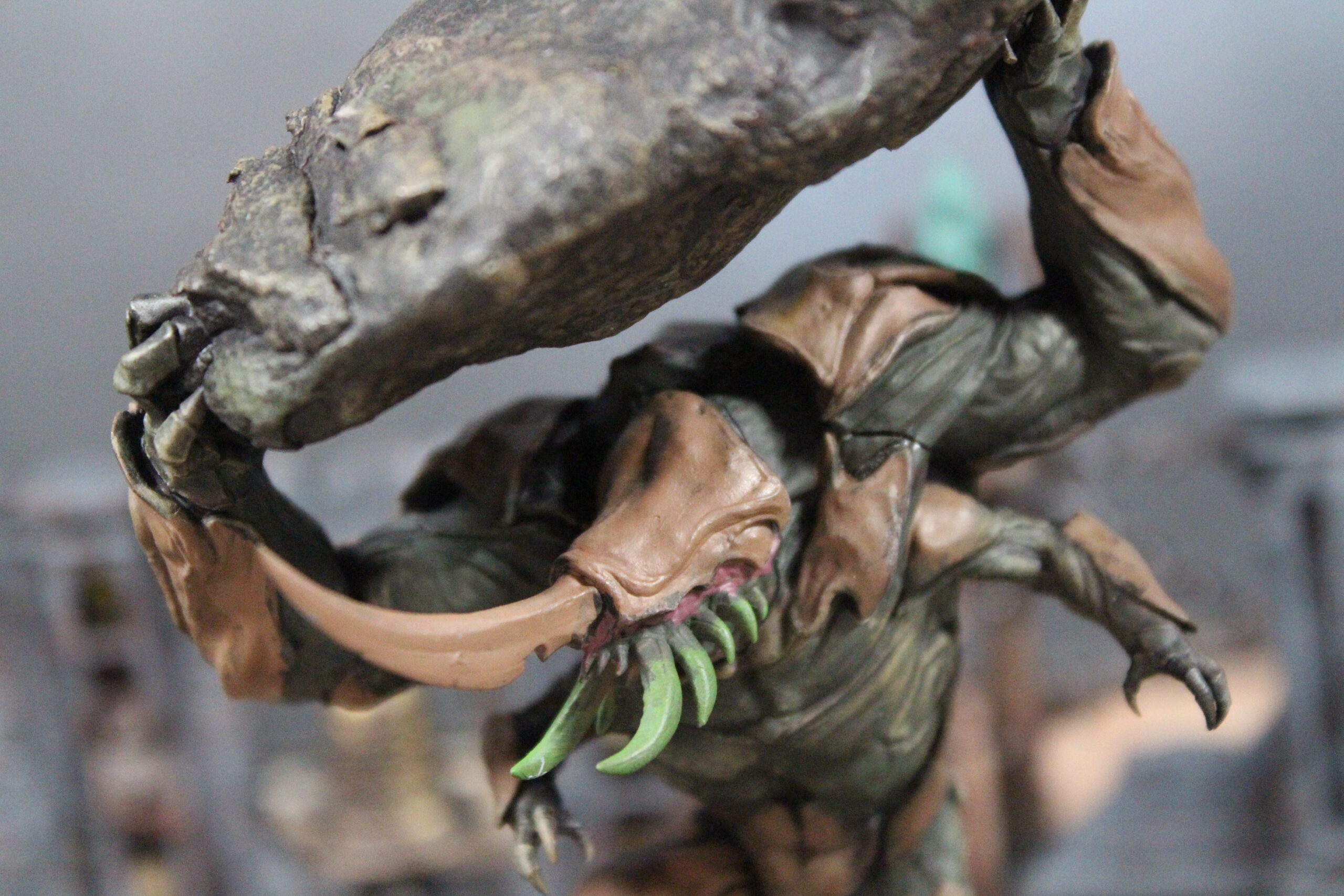 This is one of a set of three resin printed models, each one with a unique pose. The boulder is a separate part, so the model also looks good without it. It was painted by BTP artist Luna. I added in the green chelicerae with purple undertones at the base to give it some pop. The colors were Olive Green by Vallejo and Mulled Berry by Army Painter. I painted them up for fun at first, but ended up selling them to a friend. By the way, BTP is still going strong. My sister recently pointed out that this site is a bit dated (OK, a lot dated) and I’m trying to rectify that.